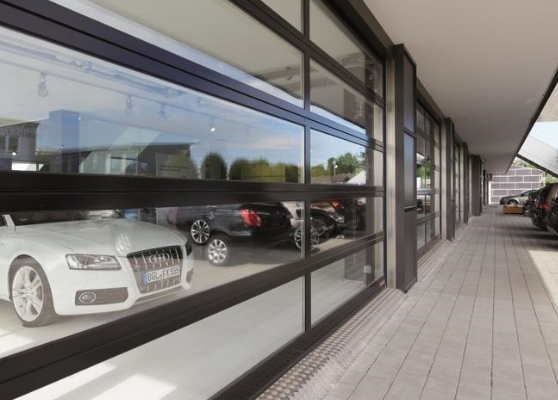 Ворота ALR 42 Glazing - витринного типа: сплошные поля остекления с натуральным стеклом позволяют свободно осматривать торговые залы и выставочные помещения. Одинаковые по высоте поля остекления изготавливаются для ворот шириной до 3330 мм без вертикальных перекладин.